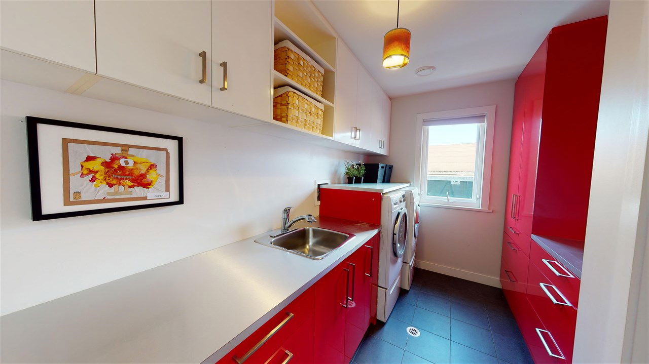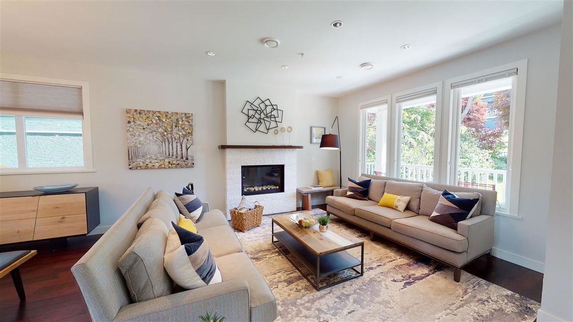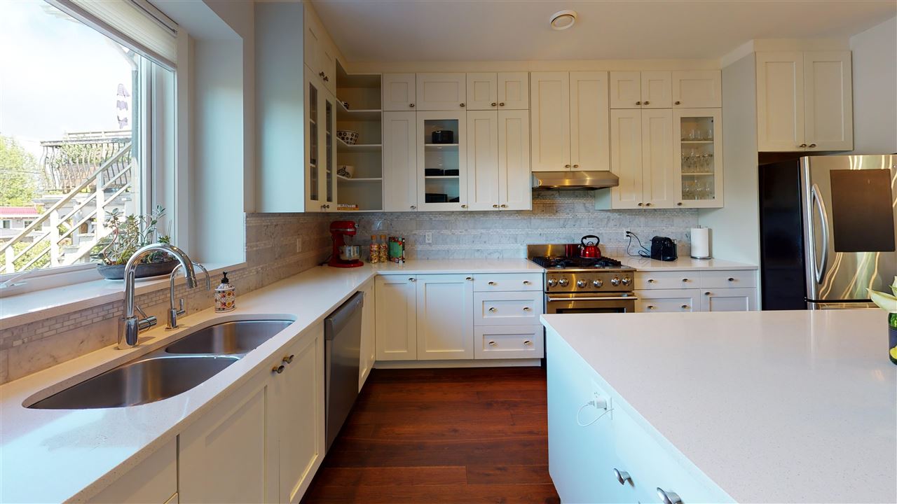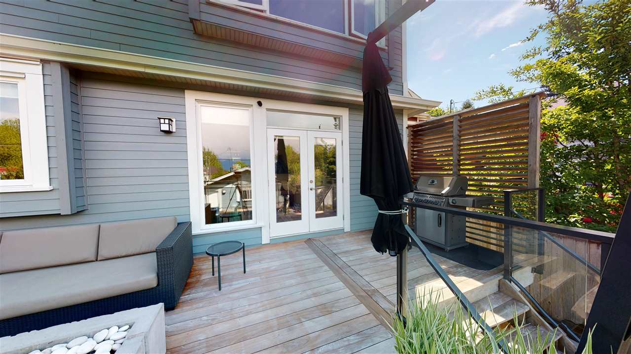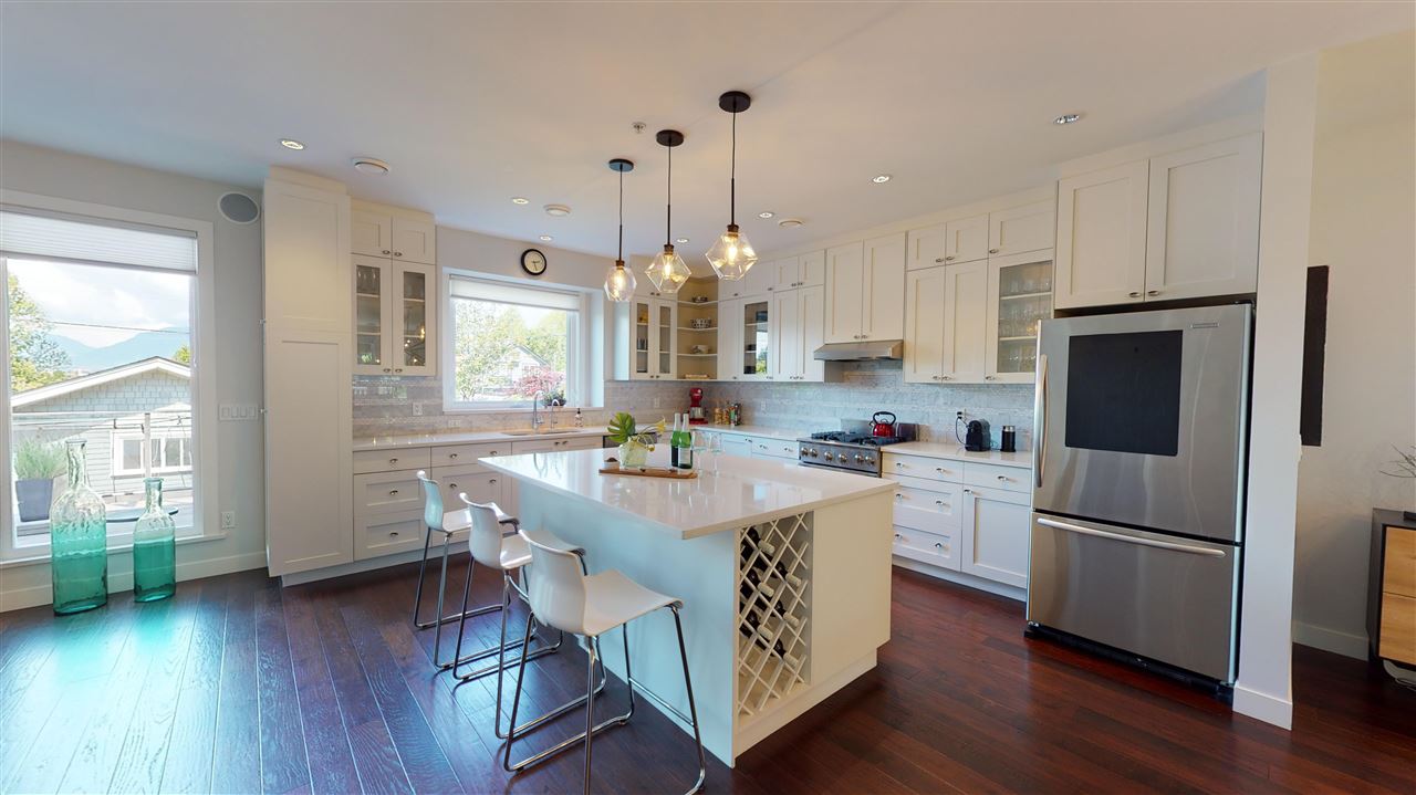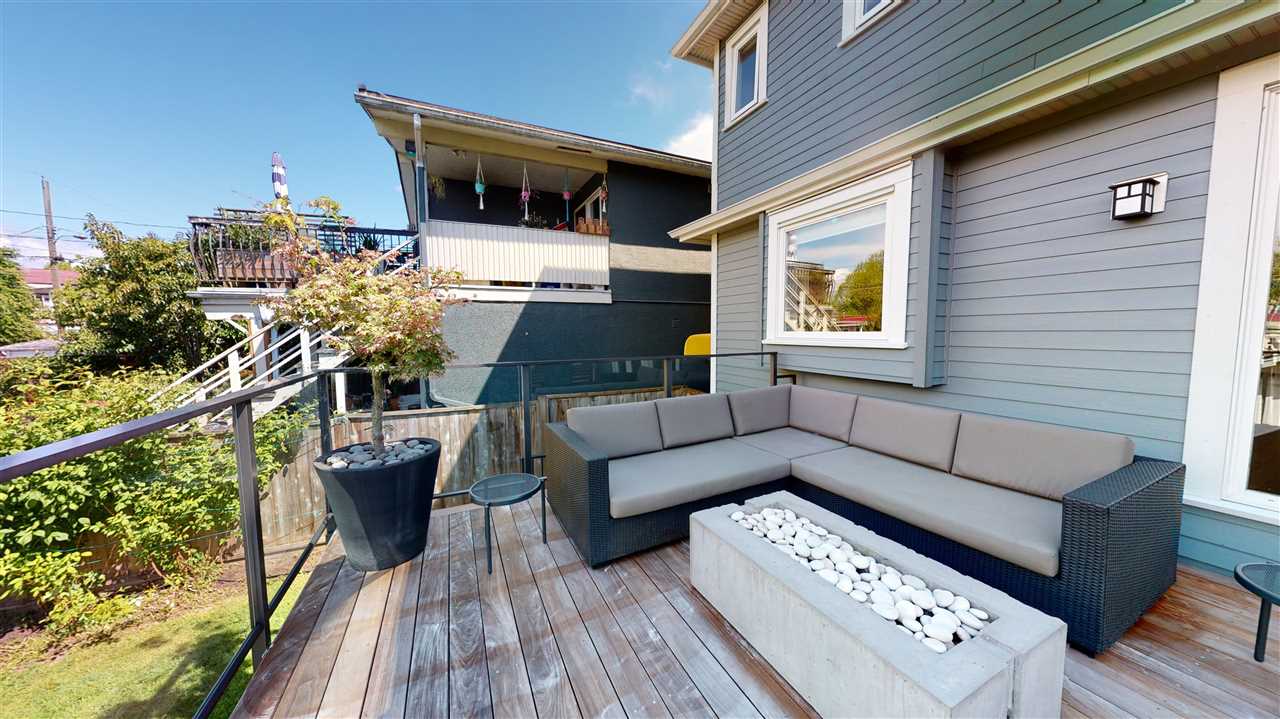 Main/Fraser family home on a wonderful street. Nearly 3300 SQFT on extra deep 37′ x 143′ lot. This 12 year old home features spacious open plan living & generous room sizes. Fabulous kitchen/fam rm with built ins is perfect for entertaining with large island and french doors open to 420 SQFT Brazilian h/w deck with firepit and gas BBQ hookup. Formal dining & living with gas fp, office and powder room on main. H/W floors & A/C on main and up, radiant in floor heat throughout. 3 large bedrooms + laundry up, expansive master suite with great mountain views. 4th bdrm and full bath down ideal for a nanny plus what could be a bachelor or 1 bdrm suite currently all owner occupied. Terrific fenced yard and double garage with lane access.