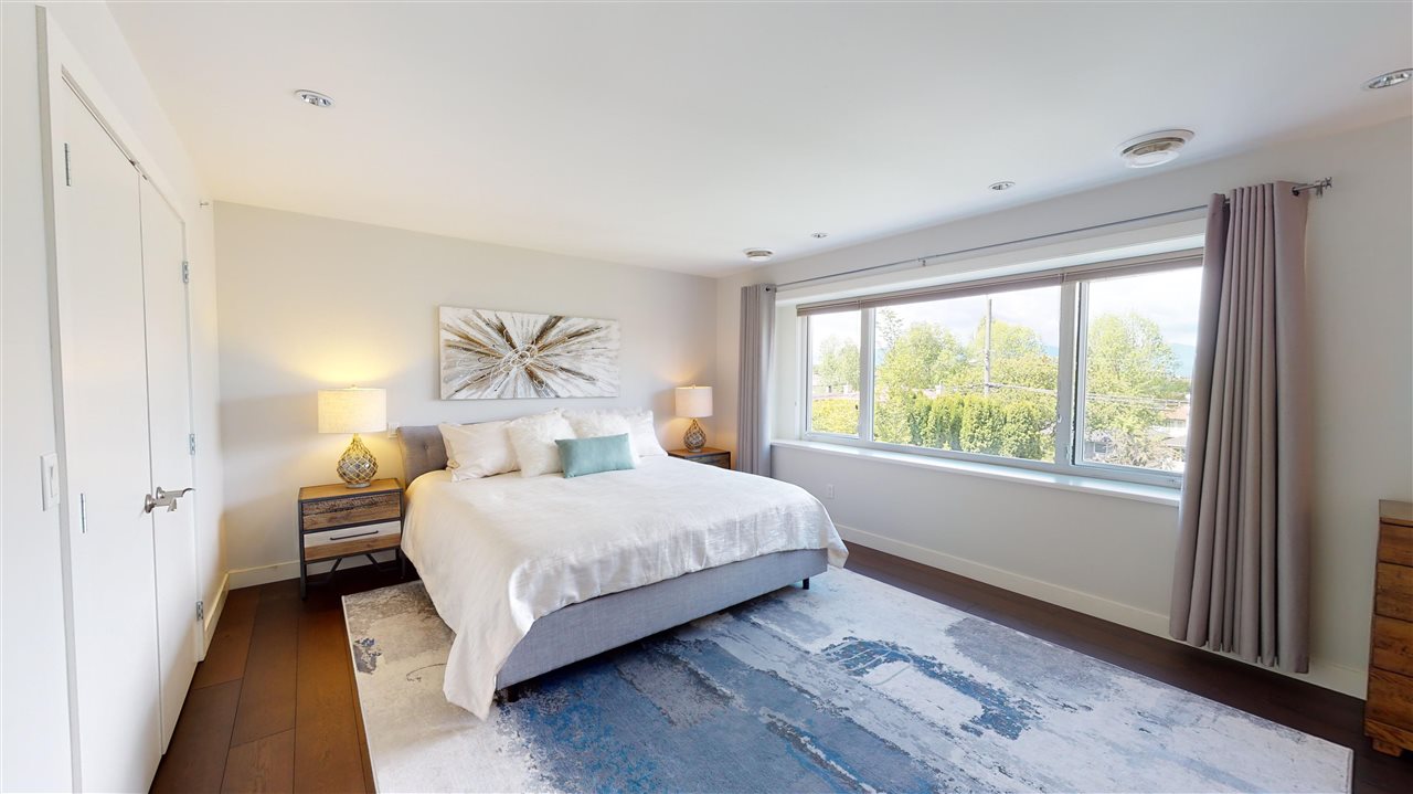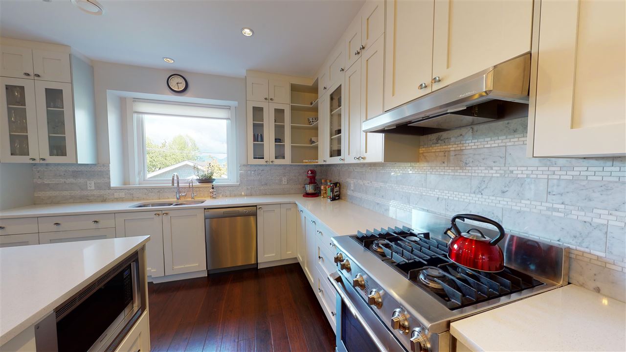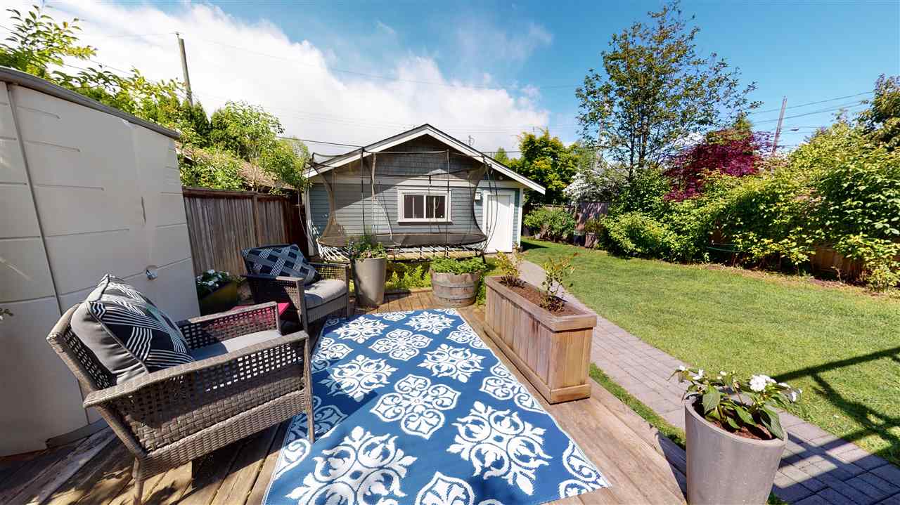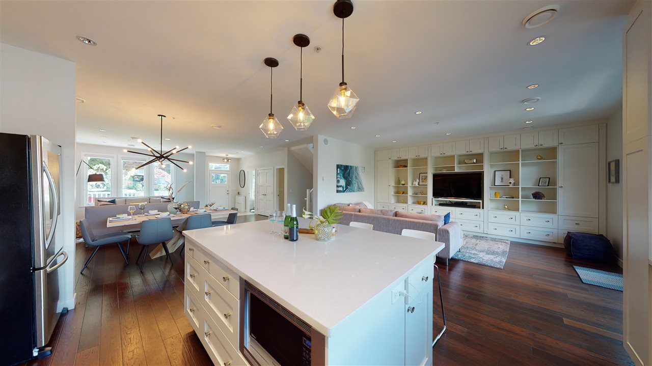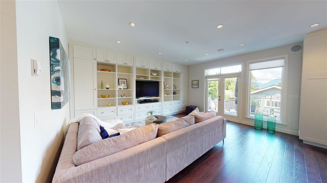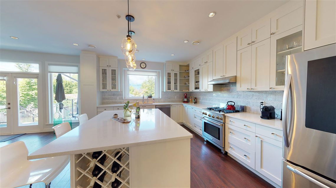 Main/Fraser family home on a wonderful street. Nearly 3300 SQFT on extra deep 37′ x 143′ lot. This 12 year old home features spacious open plan living & generous room sizes. Fabulous kitchen/fam rm with built ins is perfect for entertaining with large island and french doors open to 420 SQFT Brazilian h/w deck with firepit and gas BBQ hookup. Formal dining & living with gas fp, office and powder room on main. H/W floors & A/C on main and up, radiant in floor heat throughout. 3 large bedrooms + laundry up, expansive master suite with great mountain views. 4th bdrm and full bath down ideal for a nanny plus what could be a bachelor or 1 bdrm suite currently all owner occupied. Terrific fenced yard and double garage with lane access.